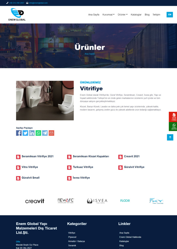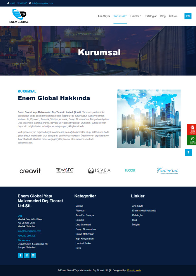 Yapı ve İnşaat ürünlerinin tüm dünyaya satışını gerçekleştiren, sektörünün önde gelen firmalarından olan Enem Global Kurumsal Web Sitesi